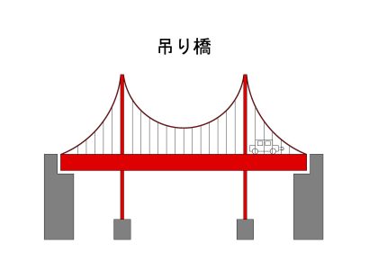 吊り橋とは、塔を建て大きな引張耐力をもつ鋼製ケーブルを塔の上に張り渡す橋のことをいう。明石海峡大橋、レインボーブリッジは、吊り橋に該当する。